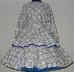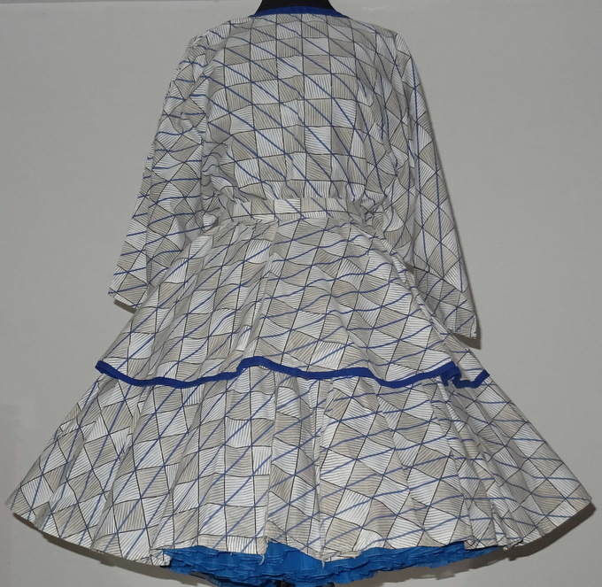 Rock: weitschwingender Tellerrock mit 29 cm Überrock der Überrock ist in dunkelblauem Stoffband eingefasst 2,5 cm breiter starrer Bund oben durch Knopf zu schließen und 2 mal verstellbar