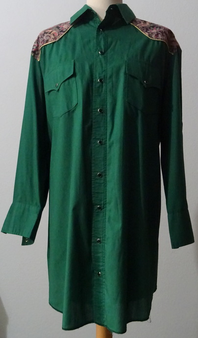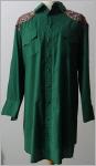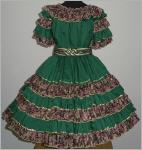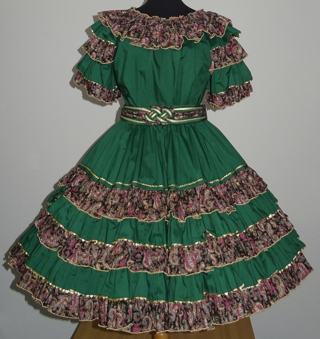 Rock: sehr weitschwingender Tellerrock 4 cm breiter Gummibund verziert mit 5 mal Volant die Volants sind abwechselnd in der Farbe des Musters und unigrün, jeweils goldfarben verziert