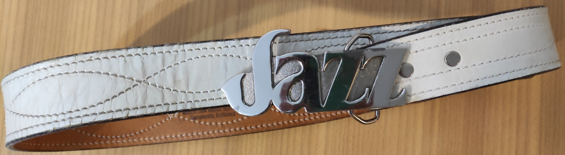 Weißer Ledergürtel stepgemustert. Mit Belt-Buckle in Silber "Jazz". Buckle kann jederzeit gewechselt werden. Breite: 3,5cm Länge: 90 bis 102 cm