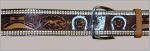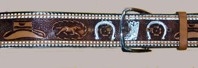 brauner Ledergürtel mit silberfarbener Schliesse eingeprägt silberne Hufeisen und Stiefel, Hut und galoopierendes Pferd in braun Schrift an den Rändern mit weissen Punkten verziert
