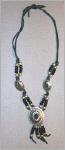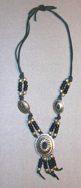 Bolo-Tie in der Art einer HalsketteIndianerartWildlederkordel mit Perlen und Conchos in verschiedenen Grössen