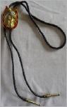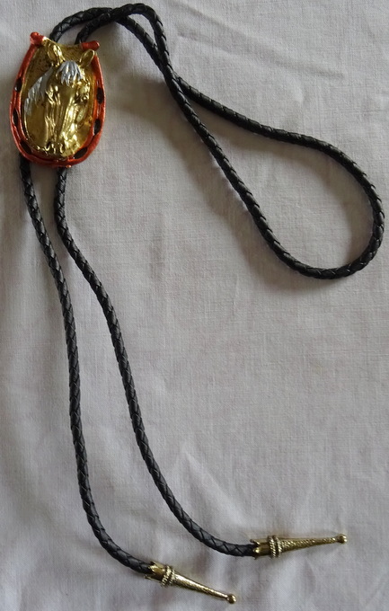 Bolo Tie mit goldfarbenem Pferdekopf mit weisser MähneFassung hufeisenförmig3-dimensional5 cm Höhe3,5 cm Breite schwarze Kunstlederkordel mit goldfarbenen Spitzenneu