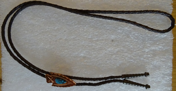 kupferfarbenes Bolo Tie in Pfeilspitzen-Form mit türisfarbenem Stein4 cm Höhe2,5 cm Breite dunkelbraune Kunstlederkordel mit braunen Spitzenguter Zustand