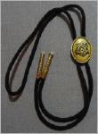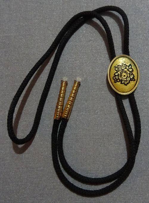 Bolo Tie mit goldfarbenem ovalem Amulett, verziert mit schwarzer Blüte 3,0 cm Höhe2,5 cm Breiteschwarze Stoffkordel mit goldfarbenen SpitzenNEU