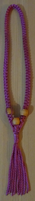 Bolo Tie in altrosaaus kunstvoll geflochtenem Material (Makramee-Art) nach vorne sind 3 braune Holzkugeln in der Größe 3 cm eingeflochtendas Ganze zieren 10 cm lange SchnürchenGesamtlänge: 48 cmguter Zustand