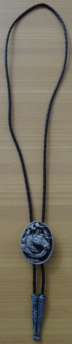 Bolo Tie silberfarbenes Medaillon auf schwarzem Grundverziert mit Pferdekopf, Hufeisen und Ornamenten5 cm x 3,5 cmschwarze Kunstlederkordel mit edel verzierten Spitzenmade in USATOP Zustand