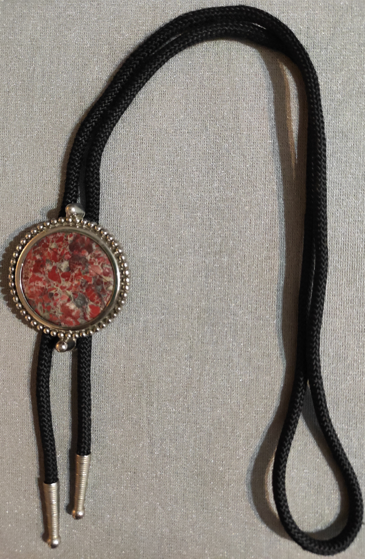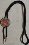 Bolo Tie silberfarbenes Medaillon mit eingelassenem Schmuckstein in BrauntönenDurchmesser Medaillon: 4,5 cmschwarze Stoffkordel mit silberfarbenen Spitzen