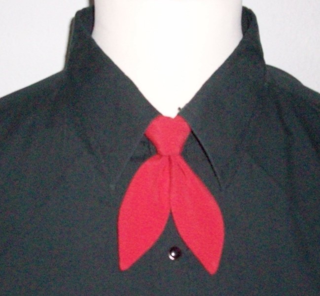 Die Kurzkrawatte wird mit dem Mittelteil in den geschlossenen Hemdkragen einghängt, die Enden kommen unter den Kragen.