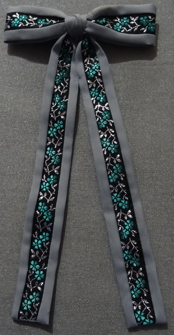 elegantes Schleifchen (Bow Tie) in grau mit schwarzer Borte und grün-silberfarbenem BlütenmusterTOP Zustand