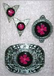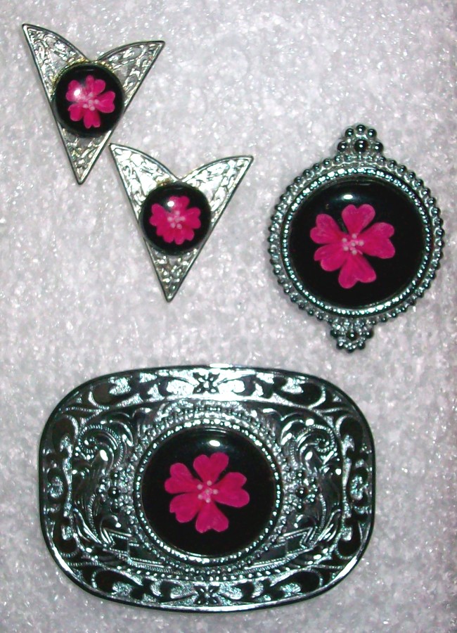 silberfarbenes Buckle mit aufgesetztem, runden Medaillon mit schwarzem Stein, in dem eine rote Fantasieblume eingelegt ist für 5 cm Gürtelbreite Grösse 10 x 7 cm