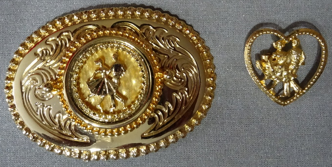 goldfarbenes Buckle , reich verziertes, rundes Medaillon mit Tanzpaarfür 4,5 cm Gürtelbreite Grösse 10 x 6,5 cmpassendes, herzförmiges Bolo Tie (ebenfalls mit Tanzpaar) mit schwarzer Stoffkordel und goldenen Spitzen
