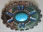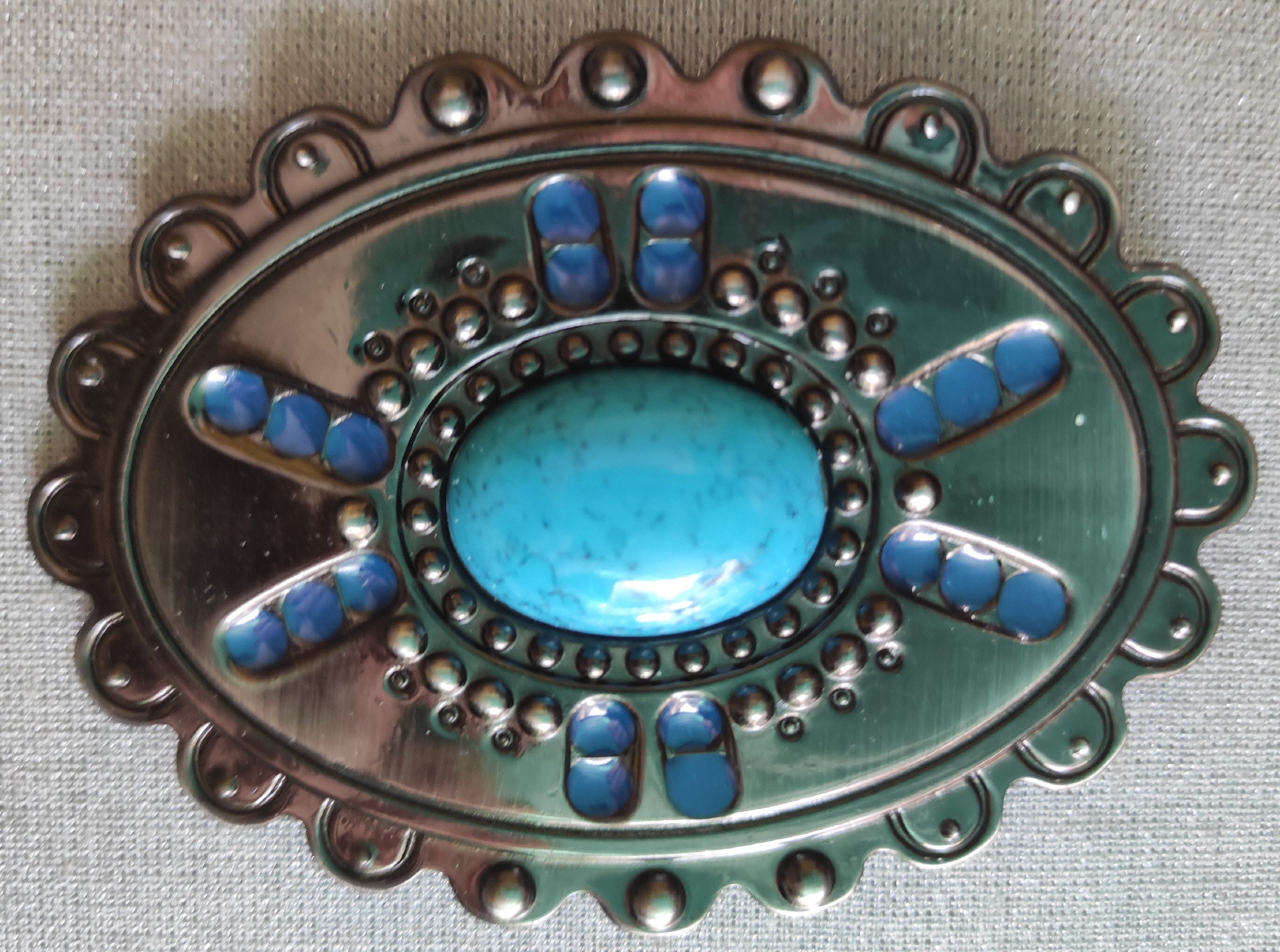 silberfarbenes Belt buckle mit großem türkisfarbenem Stein in der Mitte und blauer Verzierung in Ornamenten. Gezahnte Struktur außen. Größe Buckle: 8 cm x 6 cm für Gürtelbreite: 4 cm