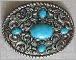 silberfarbenes ovales Belt Buckle mit großem türkisfarbenem Stein in der mitte umgeben von vier kleinen türkisfarbenen Steinen. Größe Buckle: 9 cm x 6,5cm für Gürtelbreite: 4 cm