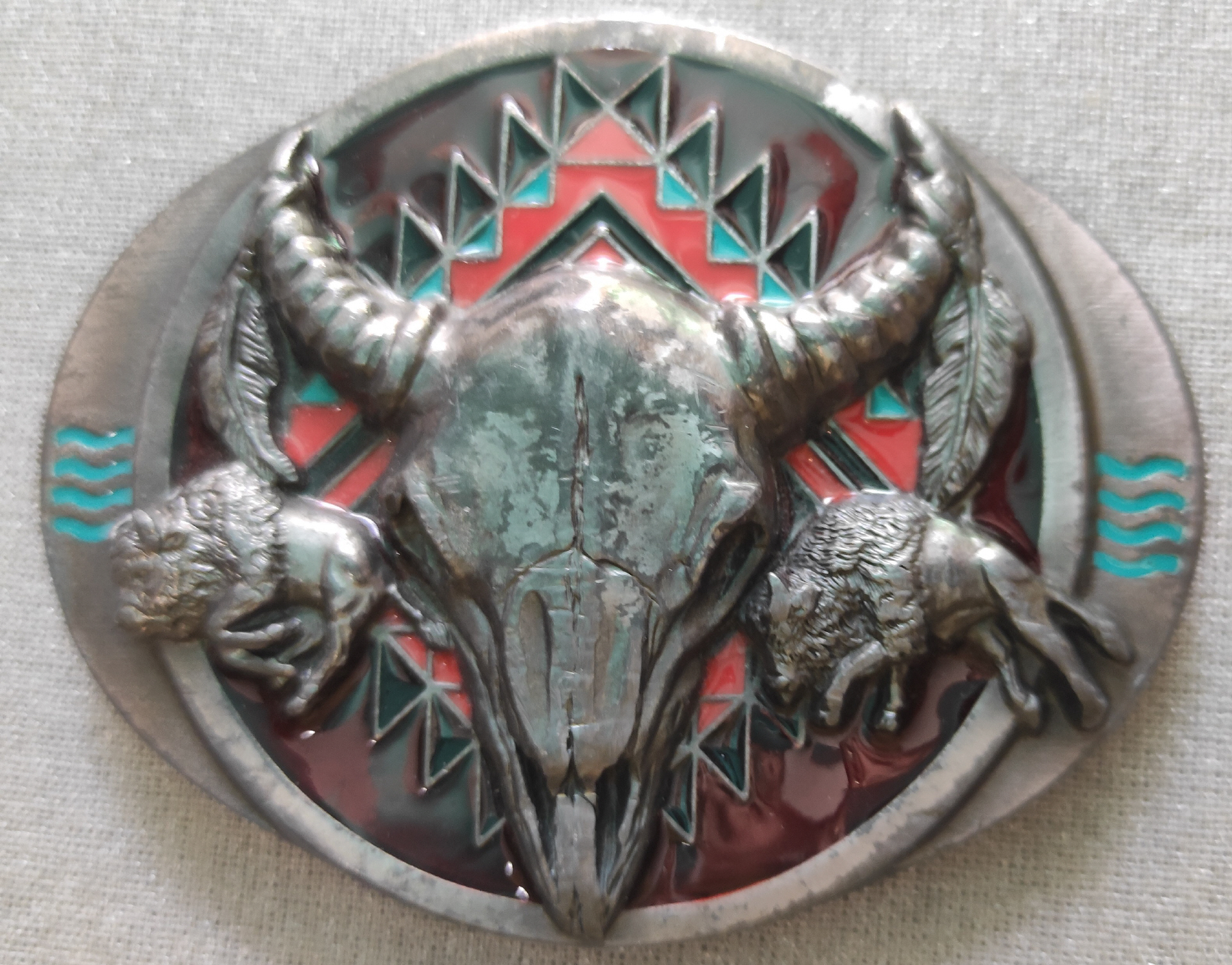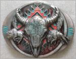 Silberfarbenes ovales Buckle mit "Longhorn"-Schädel und seitlich kleinen Buffalos. Made in USA Größe Buckle: 8,5 cm x 7 cm Für Gürtelbreite: 4 cm