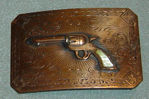 Kupferfarbenes BuckleOrnament verziertaufgesetzter Colt mit weissem Perlmuttgriffabgeschrägte Eckengebraucht4 cm Gürtelbreite Grösse 7,5 x 5 cm