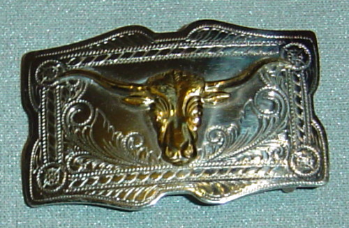Silberfarbene, zierliche Gürtelschnallemit Ornamenten versehen und gewelltem Randaufgesetzter, goldfarbener Longhornkopf2,5 cm Gürtelbreite Grösse 6,5 x 4,5 cm Nickel SilverTop Zustand