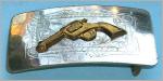 silberfarbene Gürtelschnallein der Mitte ein goldfarbener Colt auf silbernen Ornamentenleichte Gebrauchsspurenfür Gürtelbreite 4 cm Grösse 5 x 8 cm