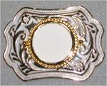 weisse Gürtelschnalle mit weissen Ornamentengeschwungener Randin der Mitte ein rundes, goldfarbenes Medaillonhier kann z.B. eine grosse Münze oder ein Stein eingebracht werden9 cm x 6 cmfür Gürtelbreite 4 cmNeu
