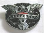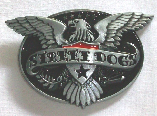 ovales, silberfarbenes Bucklemit Adler auf schwarzem GrundInschrift: Street DogsGrösse 9 x 7 cm Breite der ausgebreiteten Flügel 10,5 cmfür Gürtelbreite 4 - 4,5 cm Neu