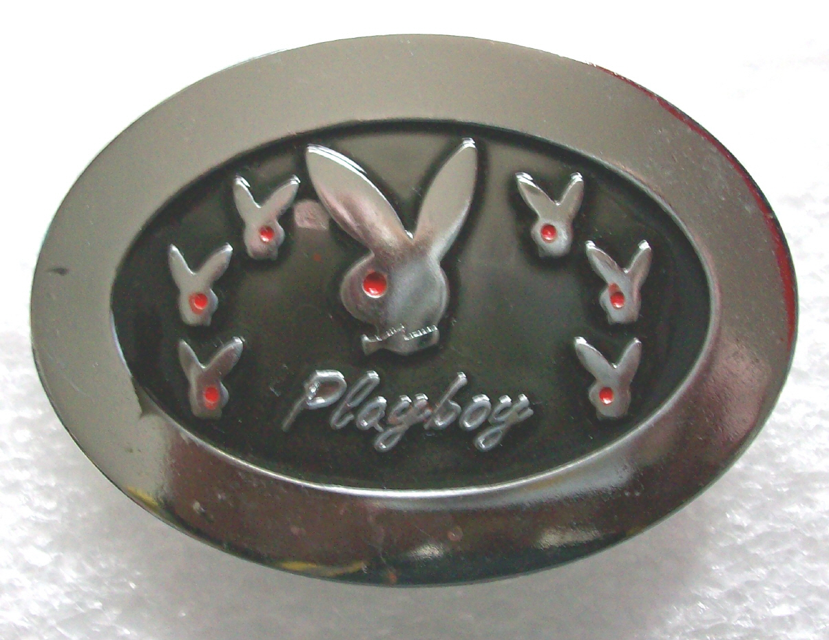 silberfarbenes, ovales Buckle mit der Aufschrift "Playboy" und 1 großer Hase und 6 kleine Hasenauf schimmerndem Hintergrundfür 3,5 cm Gürtelbreite Grösse 9,5 x 6,5 cm
