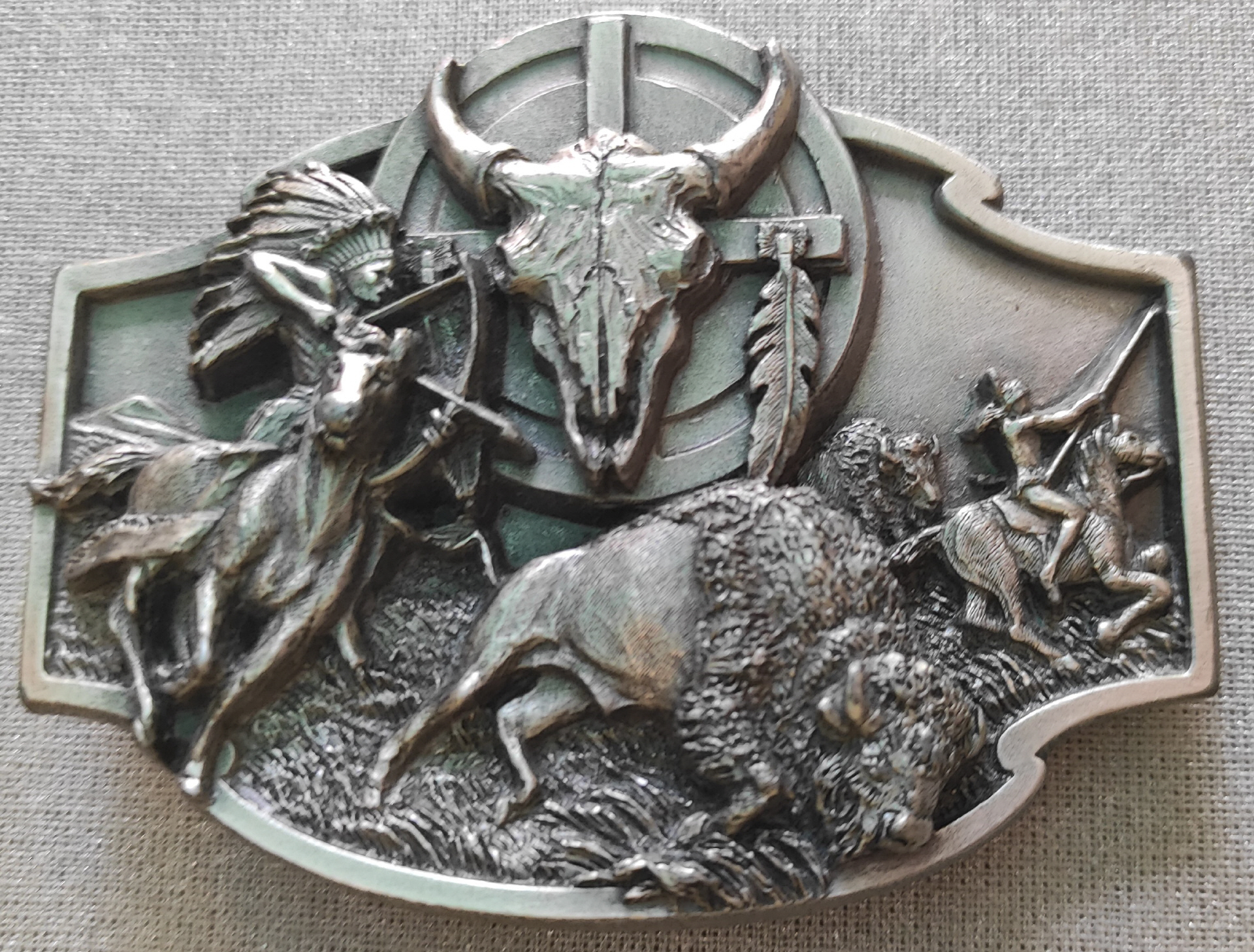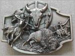 wunderschönes silberfarbenes Buckle mit interessanter Struktur und Figuren. Darstellung: Longhorn-Schädel Jagende Indianer und Buffalo Made in USA Größe Buckle: 9 cm x 7 cm für Gürtelbreite: 4 cm