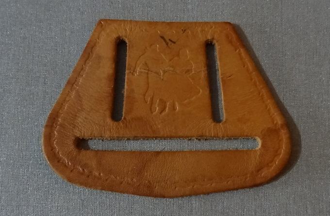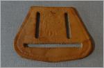 hellbrauner Leder-Handtuchhaltermit eingestanztem Tanzpaarzum Einhängen in den GürtelHandtuchgröße: 9 cmGürtelbreite: 4 cmguter Zustand