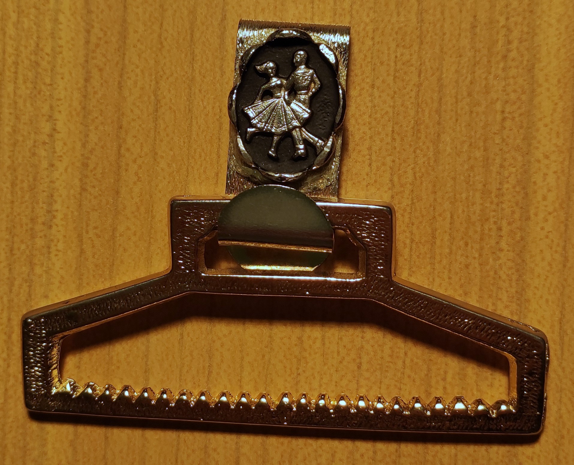 goldener Handtuchhaltersilbernes Tanzpaar auf schwarz unterlegtem Medallionzum Einhängen in den GürtelHandtuchgröße: 7,5 cmguter Zustand