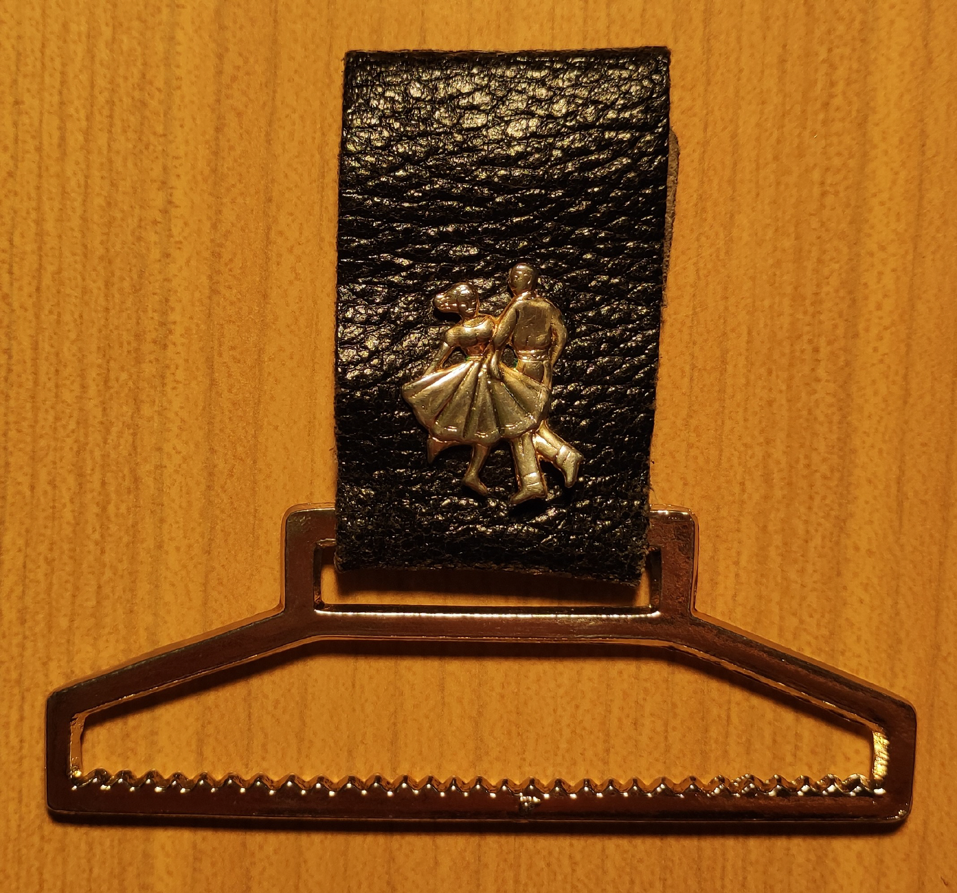 goldfarbener Handtuchhalter mit schöner schwarzer Lederschnale mit Druckknopfauf der Lederschnalle befindet sich ein goldenes Tanzpaar Handtuchgröße: 9,5 cmguter Zustand