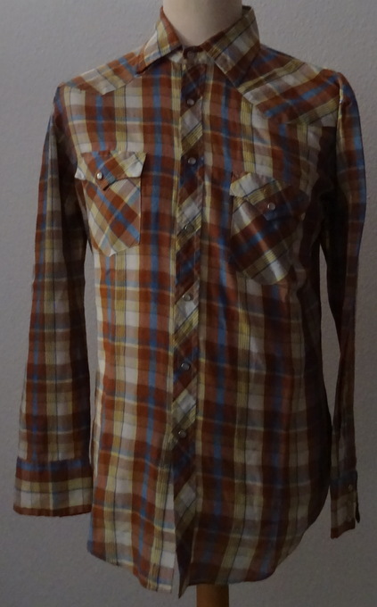 kariertes Hemd in den Farben gelb, braun und blau2 aufgesetzte Brusttaschenweisse PerlmuttdruckknöpfeMaterial:65 % Polyester35 % Cottonguter Zustand