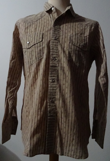 gestreiftes Hemd in den Farben braun und beige mit Streublümchenmuster2 aufgesetzte Brusttaschenweisse Perlmuttdruckknöpfemit abgerundetem Kragenvorne und hinten mit spitz zulaufendem SattelMaterial:Mischgewebesehr guter Zustand