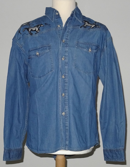 Jeanshemd vorne und hinten auf den Satteln mit Pferden verziert2 aufgesetzte Brusttaschenweiß-graue KnöpfeMaterial:100 % Baumwollesehr guter Zustand