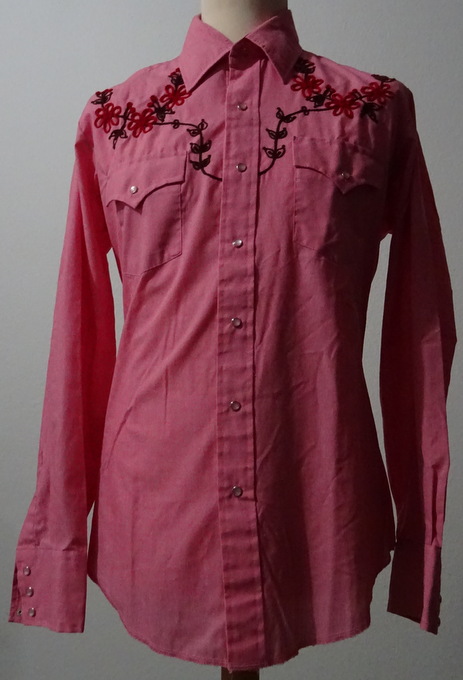 altrosafarbenes Hemd mit dunkelroten Blüten und dunkelbraunen Ranken bestickt (nur im Vorderteil)2 aufgesetzte Brusttaschenweisse Perlmuttdruckknöpfehinten mit spitz zulaufendem SattelMaterial:MischgewebeTOP Zustand