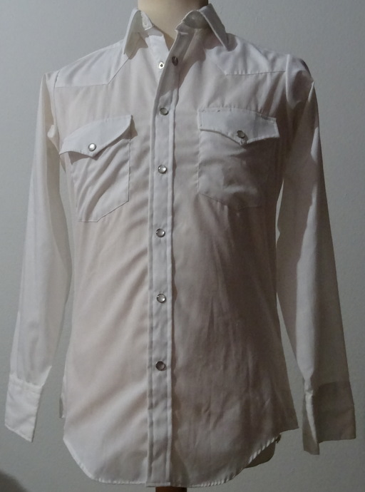 weisses Hemd2 aufgesetzte Brusttaschenweisse Perlmuttdruckknöpfehinten spitz zulaufender Sattel US Größe: 14 - 14 1/2Material:65 % Polyester35 % Cottonsehr guter Zustand
