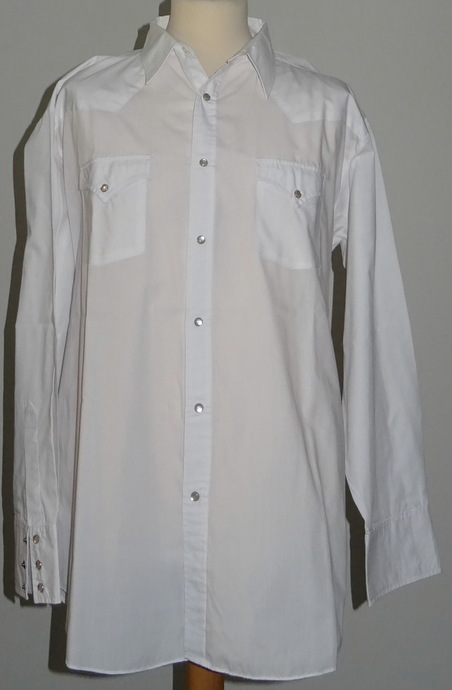 weißes Hemd hinten leicht spitz zulaufender Sattelvorne zweifach spitz zulaufender Sattel2 aufgesetzte Brusttaschenweiße PerlmuttdruckknöpfeMaterial:65 % Polyester35 % Cottonguter Zustand