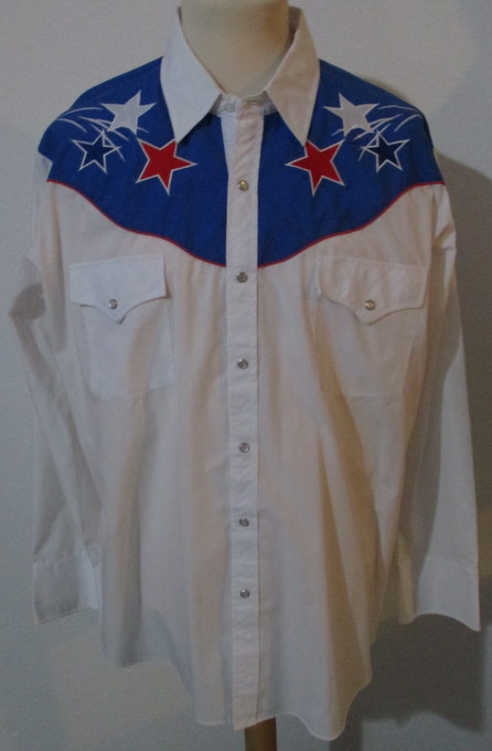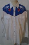 weißes Hemdmit oben ringsherum blauem Sattelmit aufgestzten Sternen in rot, blau und silber2 aufgesetzte Brusttaschen mit weissen Perlmuttdruckknöpfen versehenweisse Perlmuttdruckknöpfe65 % Polyester35 % CottonNeu, Ausstellungsmodell