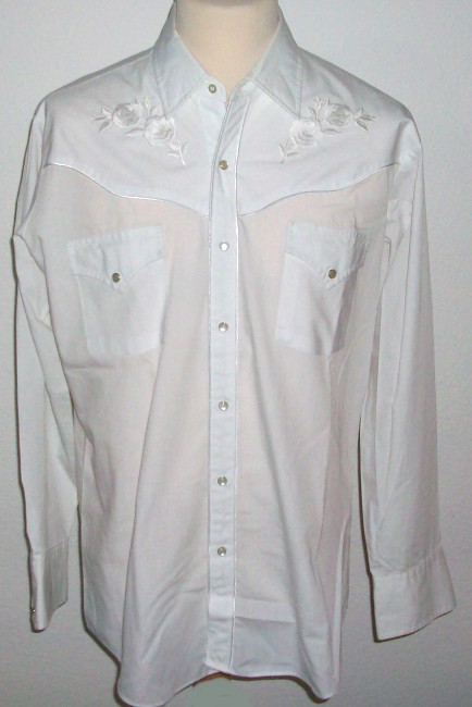 weisses HemdGrösse Largegestickte weisse Rosen auf dem Sattel2 aufgesetzte Brusttschenweisse Perlmutt Druckknöpfeguter Zustand65% Polyester, 35% Cotton