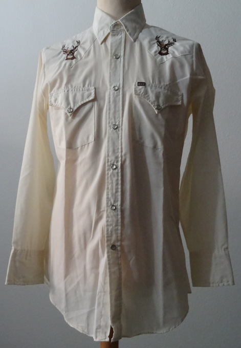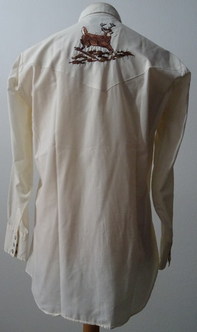 rohweisses (hellbeiges) Hemdvorne mit Hirschköpfen bestickt hinten mit einem braunen Hirsch bestickt 2 aufgesetzte Brusttaschenweisse Perlmuttdruckknöpfehinten und vorne spitz zulaufender Sattel und jeweils besticktMaterial:MischgewebeTOP Zustand, wie Neu