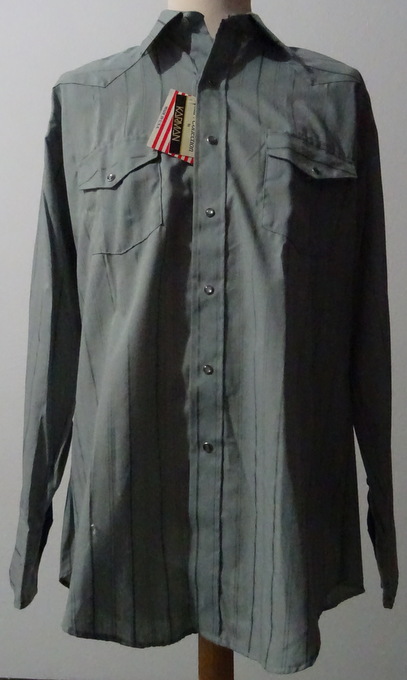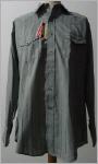 graues Hemd mit leichter Streifenstruktur2 aufgesetzte Brusttaschenhellgraue Perlmuttdruckknöpfevorne und hinten spitz zulaufender SattelMaterial:80 % Polyester20 % CottonNEU NEU NEU