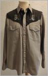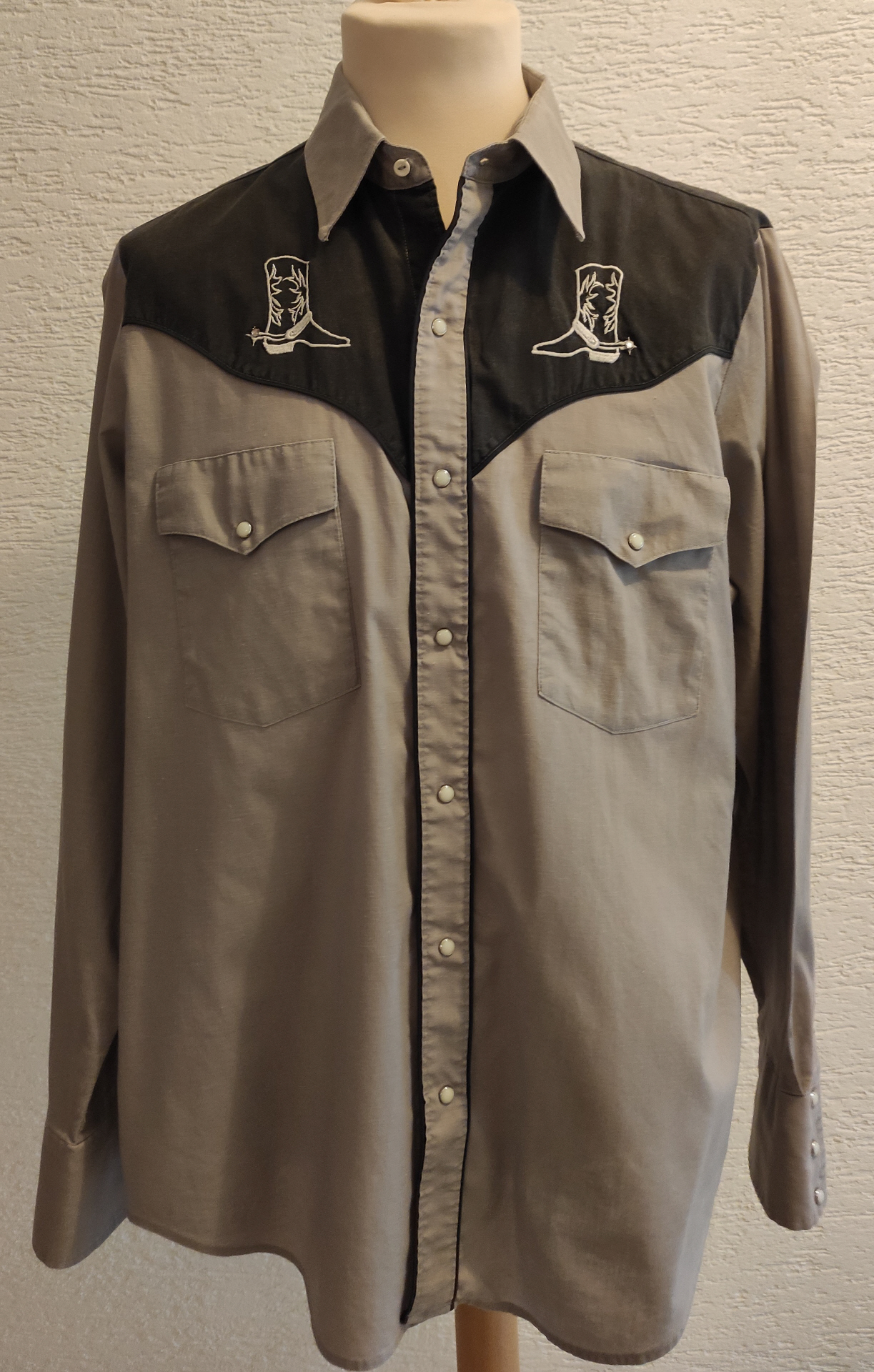 graues Hemd von Carawan made in Canada mit Brust und Rückeneinsätzen in schwarzmit weiss bestickten Cowboystiefeln, der Sporn ist aus Strasssteinen2 aufgesetzte Brusttaschen mit weissen PerlmuttdruckknöpfenMaterial: 100% Cottonguter Zustand