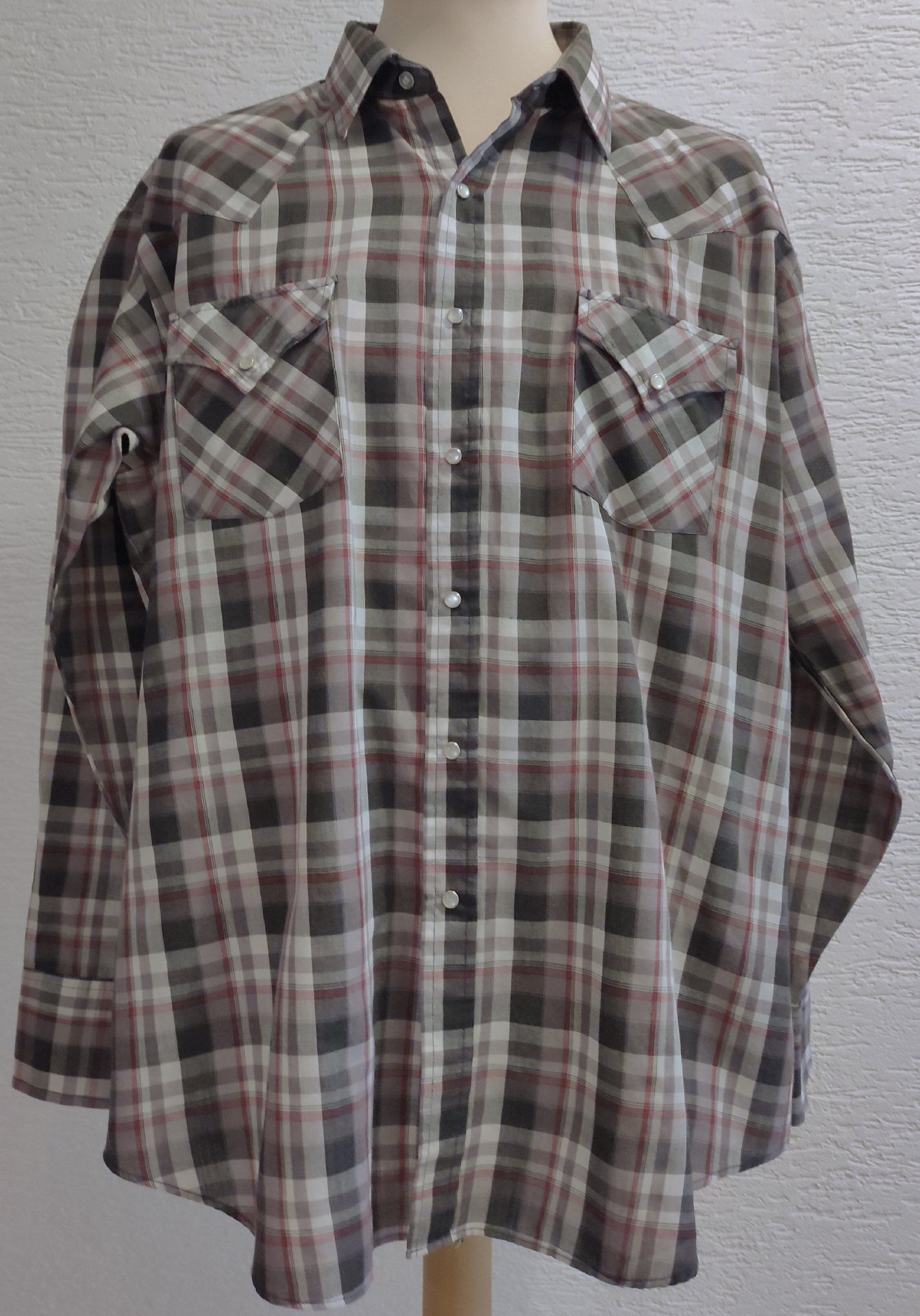 Hemd grau-weiss, rot karriert der Marke ELY Cattleman, Gr. XXL2 aufgesetzte Brusttaschen mit weissen Perlmutdruckknöpfen gerade geschnittenMaterial:65% Cotton35% Polyester