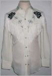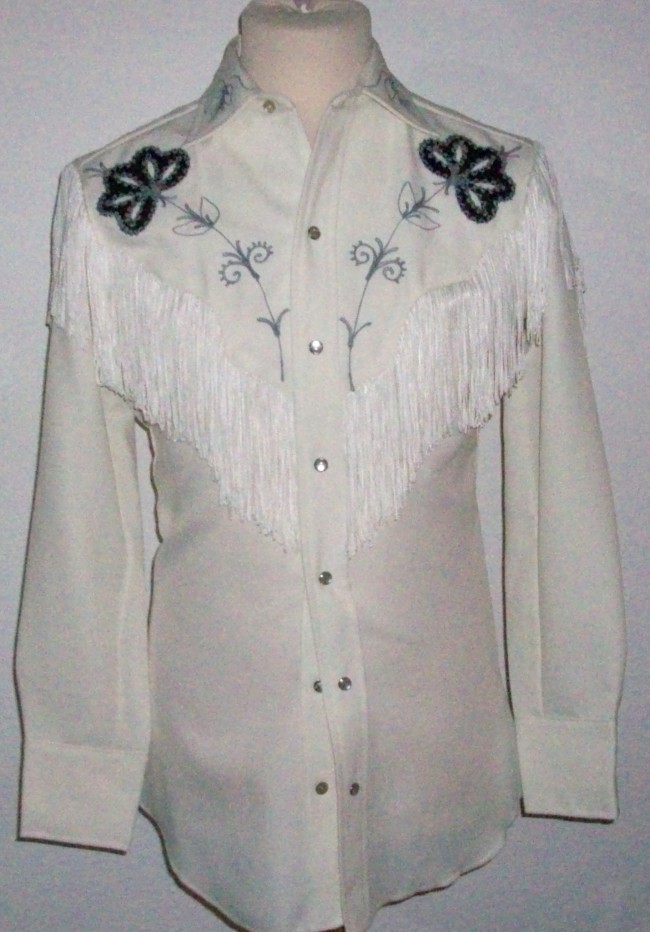 cremefarbenes Hemd mit Fransen bitte Masse beachten weisse Perlmuttdruckknöpfe vorne aufwändig bestickt mit Blumen in schwarz und grau mit Straßsteinen im Rücken wiederholt sich das Blütenmuster auf dem Sattel
