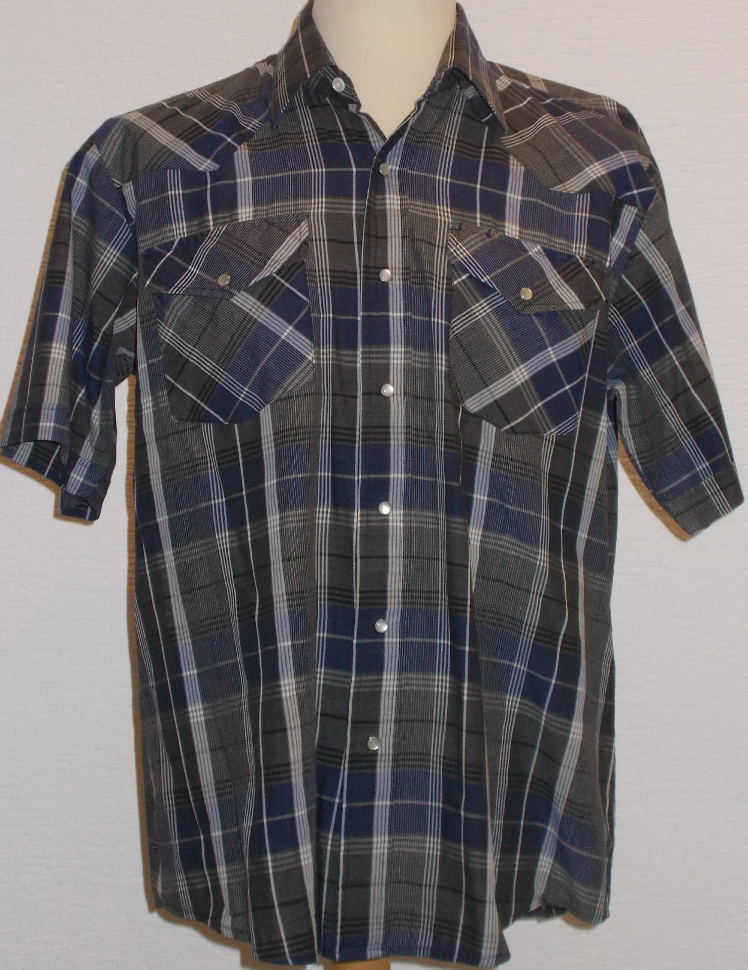 blau-grau weiss kariertes Kurzarmhemd der Marke Rock Creek Ranch Gr. L weiße Perlmutdruckknöpfe2 aufgesetzte Brusttasche mit Knopf ebenfalls mit je 2 Perlmutdruckknöpfensehr guter Zustand!