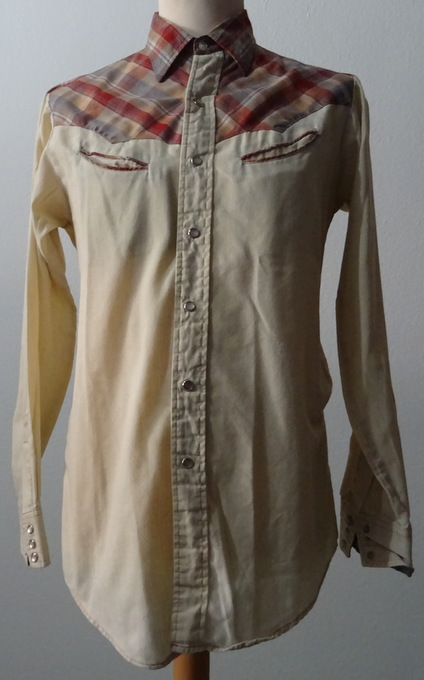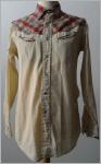 hellbeiges Hemd2 Eingrifftaschenweisse PerlmuttdruckknöpfeSattel und Kragen kariert in rauchblau und rostbraunxtra long tailsMaterial:MischgewebeNEU
