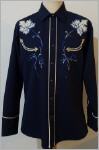 dunkelblaues Western Show Hemdvorne mit aufgesetzten Applikationen in weiss und verschiedenen Blautönen2 kurze Eingriffbrusttaschendunkelblaue Perlmuttdruckknöpfe100 % PolyesterNEU