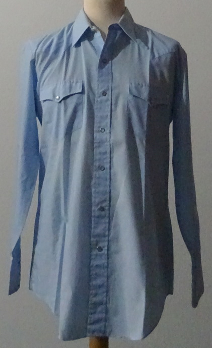 hellblaues Hemd hinten spitz zulaufender Sattelvorne zweifach spitz zulaufender Sattel2 aufgesetzte Brusttaschenweiße PerlmuttdruckknöpfeMaterial:Mischgewebesehr guter Zustand