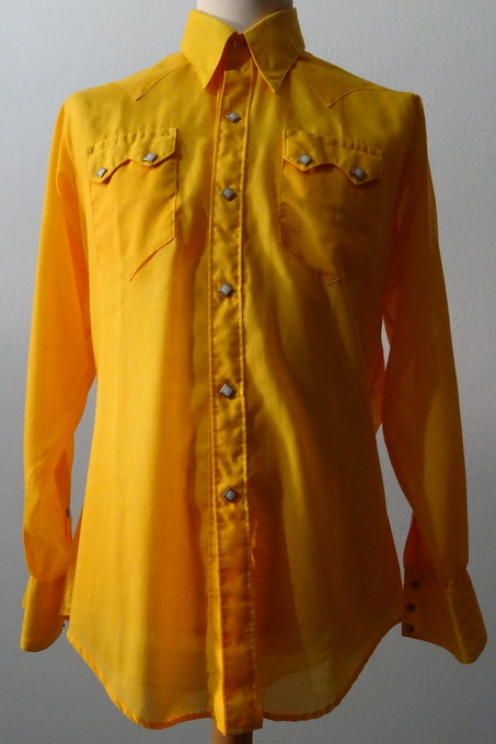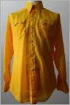 ockergelbes Hemd2 aufgesetzte Brusttaschenweisse rautenförmige Perlmuttdruckknöpfevorne und hinten spitz zulaufender SattelMaterial:MischgewebeNEU