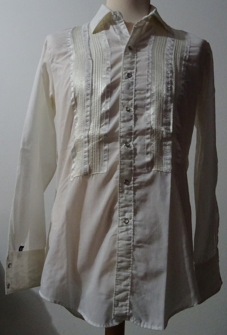 rohweisses Hemdgearbeitet wie ein Smoking Hemdmit Plisseefalten und Satinband in rohweiss (zartchampagner)weisse Perlmuttdruckknöpfehinten ein spitz zulaufender SattelMaterial:65 % Polyester35 % Cottonsehr guter Zustand