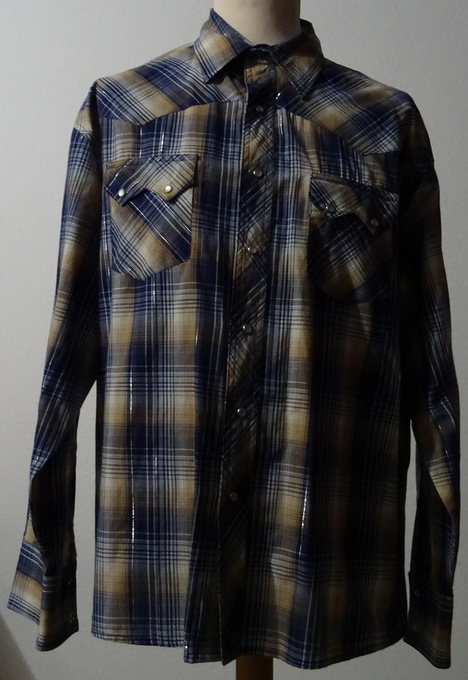 kariertes Hemd in den Farben blau und braun2 aufgesetzte Brusttaschenweisse Perlmuttdruckknöpfemit Silberfäden durchzogenvorne und hinten mit spitz zulaufendem SattelMaterial:45 % Polyester54 % Cotton1 % MetallicTop Zustand, wie Neu