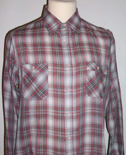 kariertes Hemd in den Farben grau und dunkelrotnormale Knöpfe (keine Druckknöpfe)2 aufgesetzte BrusttaschenGrösse Lsehr guter Zustand65% Polyester, 35% Cotton