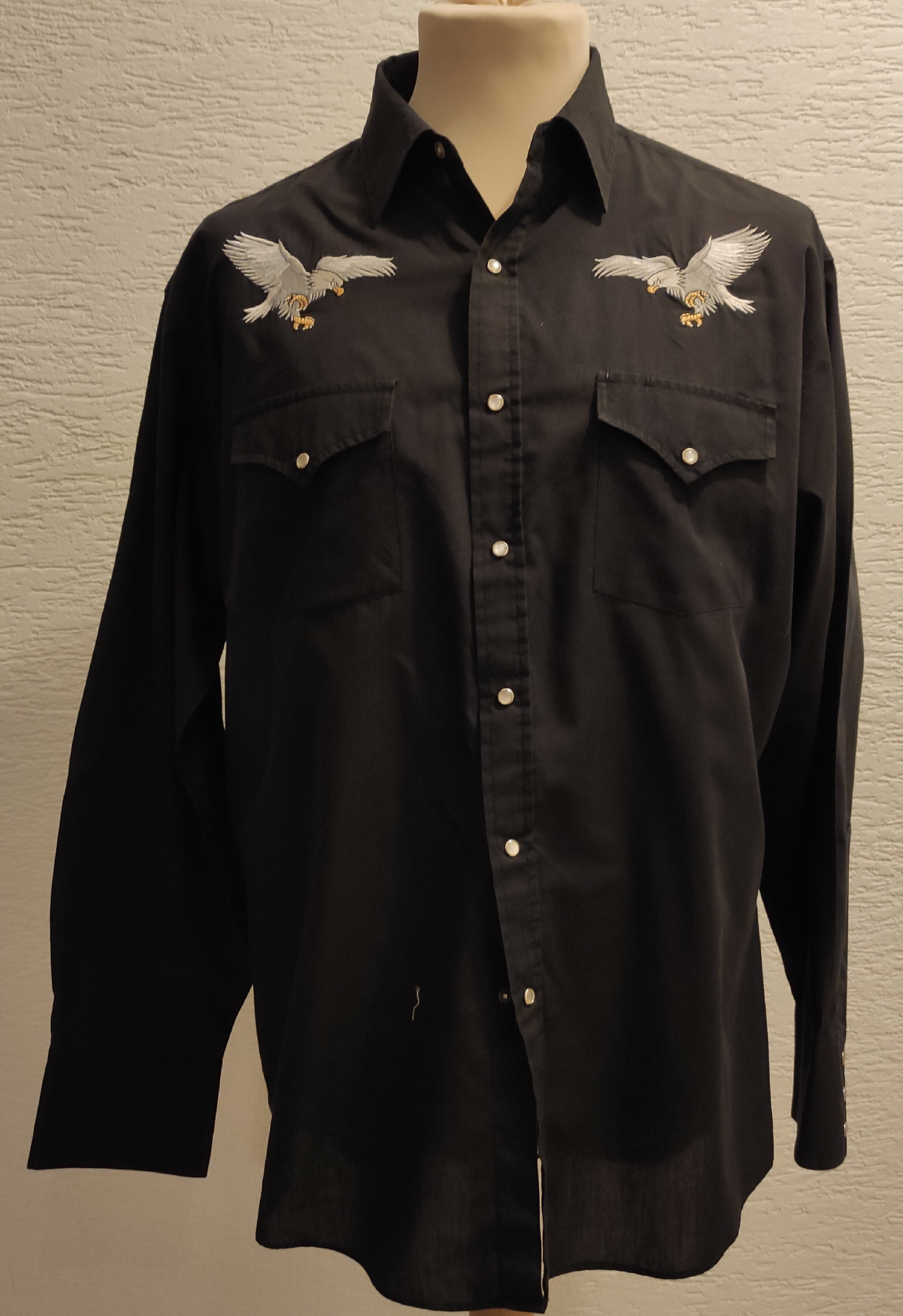 schwarzes Hemd mit aufgestickten Adlernvon High noones hat weiss Perlmutdruckknöpfe2 aufgesetzte Brusttaschen mit weissen PerlmutdruckknöpfenMaterial:65% Polyester35% CottonTOP Zustand